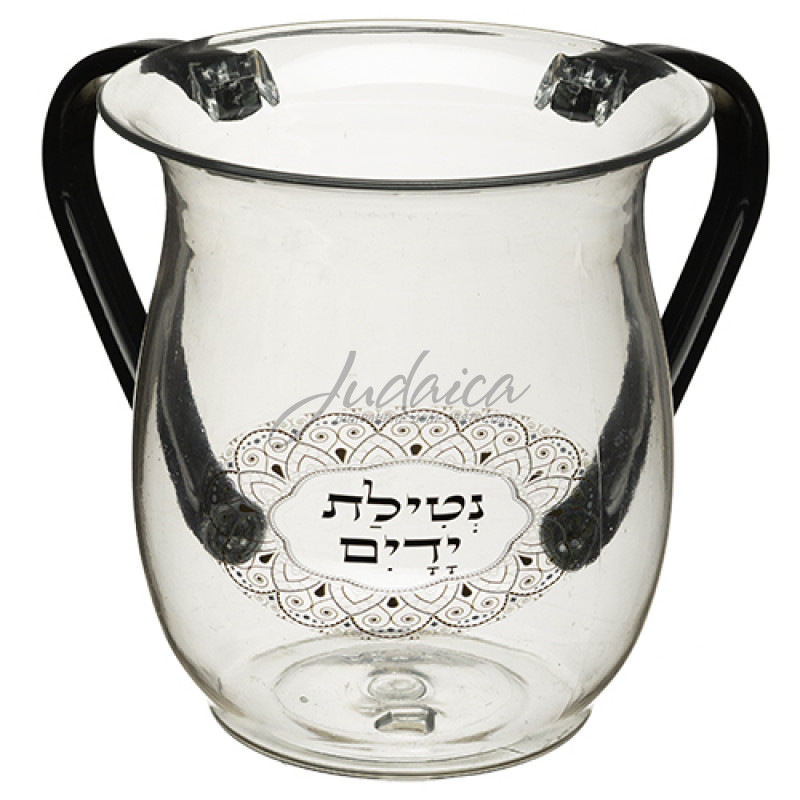 Прозрачный сосуд для омовения рук с нежным принтом в виде кружева и надписью «Нетилат Ядаим». Особенностью этого нетелатника являются цветные ручки. Он выполнен из прочного, пластичного материала устойчивого к ударам и падениям.
