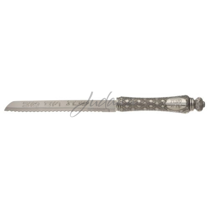 Нож для халы с декоративной ручкой и гравировкой «Шаббат ВеЙом Тов». Лезвие с зубчатым краем обеспечивает удобное и аккуратное разрезание хлеба. Ручка украшена узором, придающим изделию классический вид. Идеально подходит для шаббатного стола или в подарок.