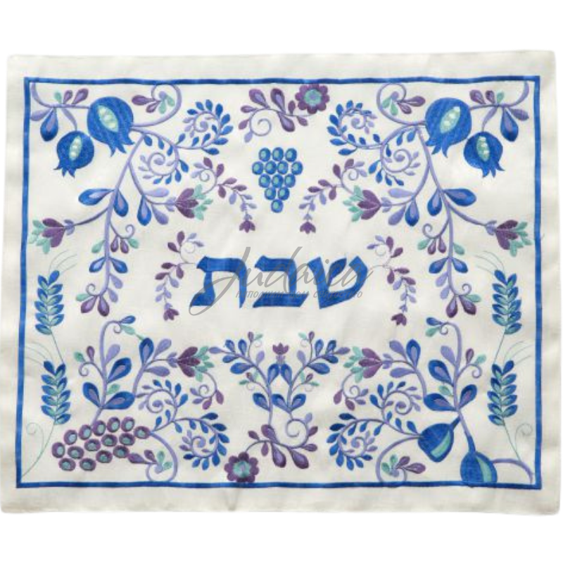 Покрывало украшено изящной вышивкой в синих тонах, в центре синим цветом вышито слово «Шаббат» (Суббота) на иврите.
