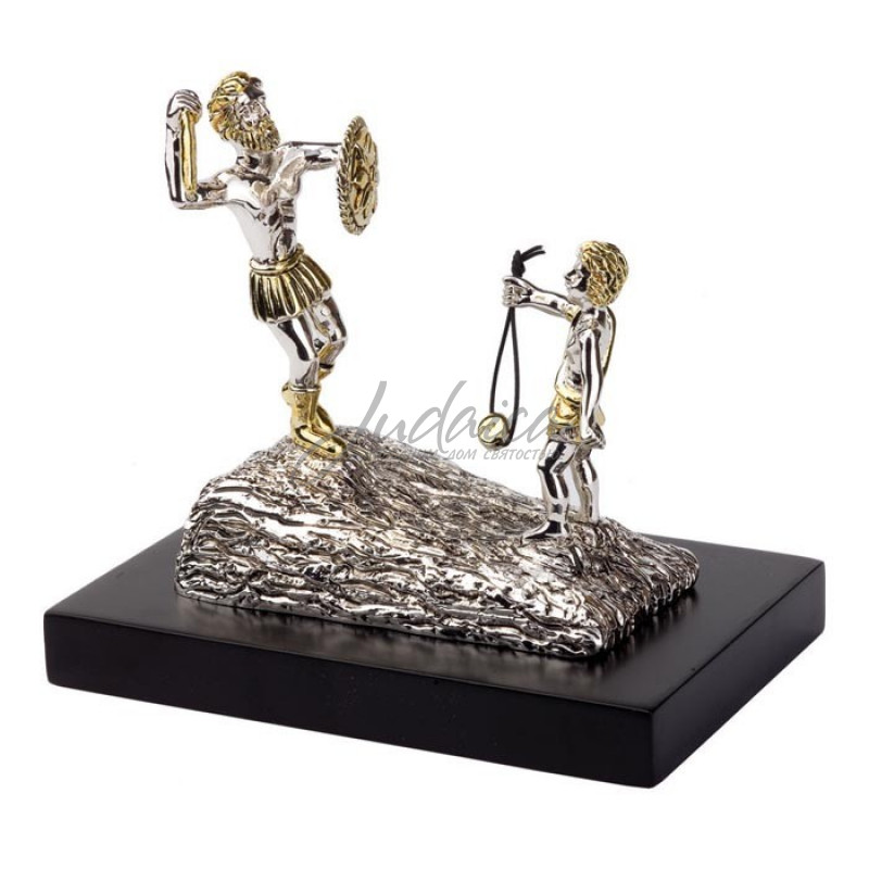 Фигуры Давида и Голиафа изготовлены из качественного материала и покрыты серебром, что придает статуэтке блеск и элегантность. Давид изображен в момент, когда он готовится к битве, держа в руках пращу и камень, который он намеревается бросить в Голиафа. Сам воин представлен в полном вооружении, готовый к сражению с маленьким Давидом.
