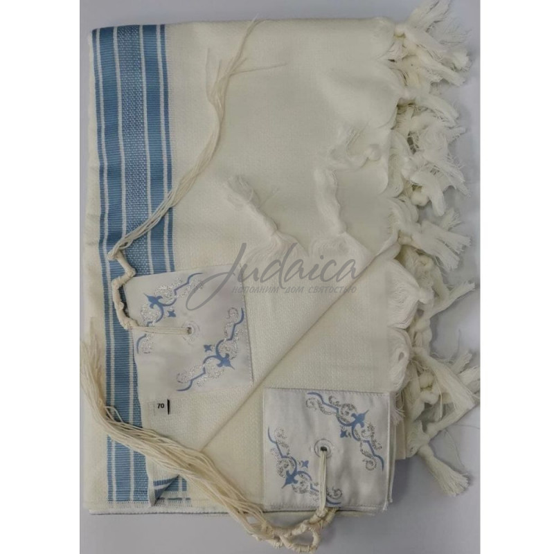 Талит изготовлен из хлопка, голубого цвета. В комплекте идут нити-цицит. Произведен в Израиле и соответствует всем требованиям.